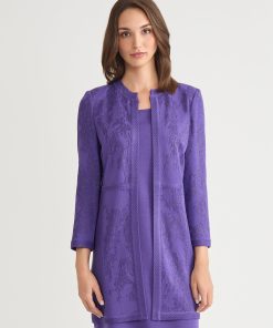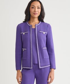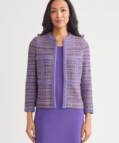 Misook Women’s Heritage Checkered Trim Knit Jacket – True Fit | Concord Purple & Black & New Ivory