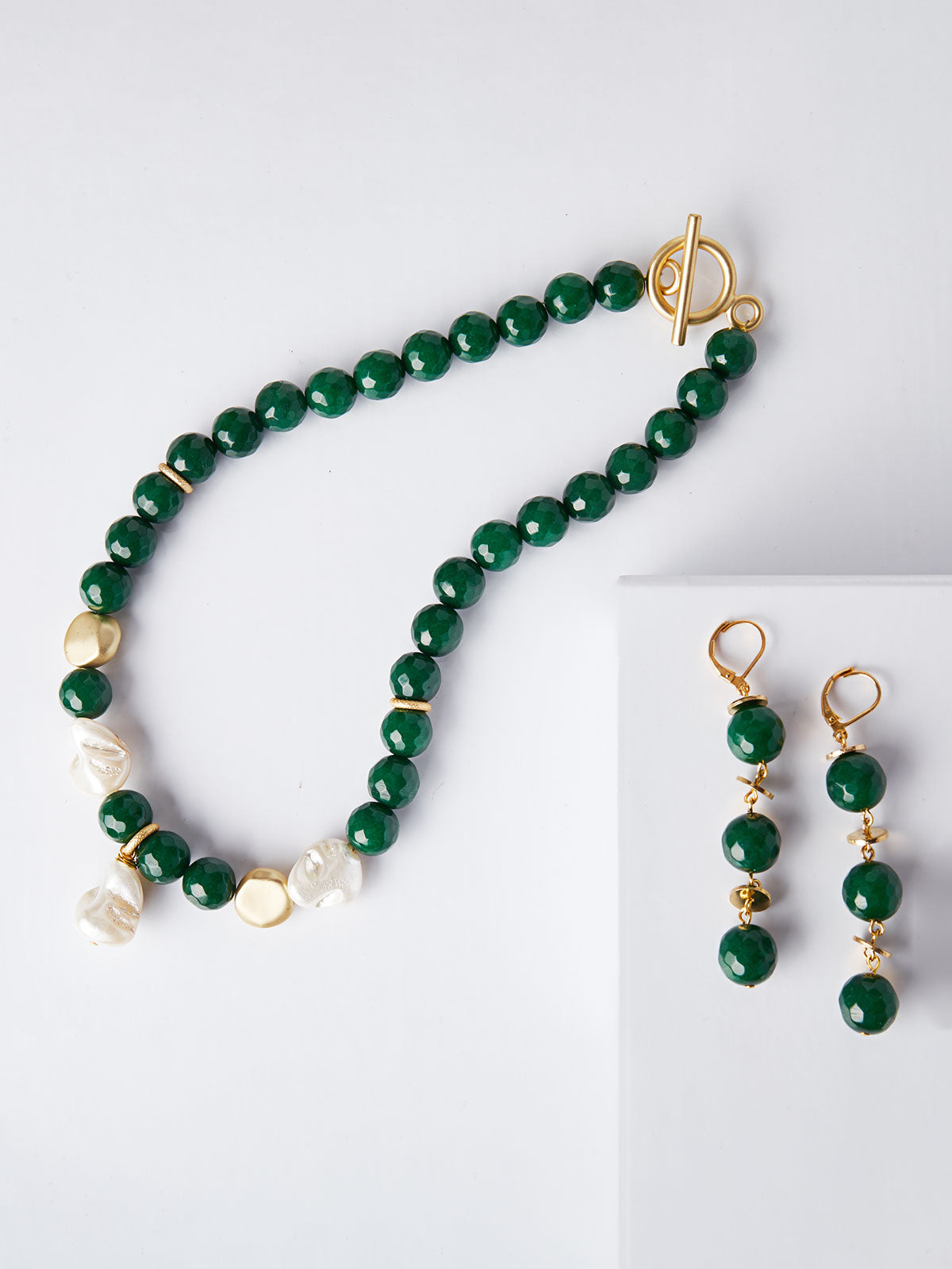Our Baroque Green Jade and Mother of Pearl necklace is an elegant piece that would be the icing on any outfit you pair with it. Pair back to the matching earrings to complete the set.