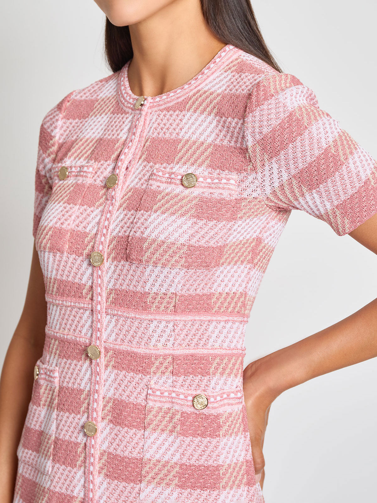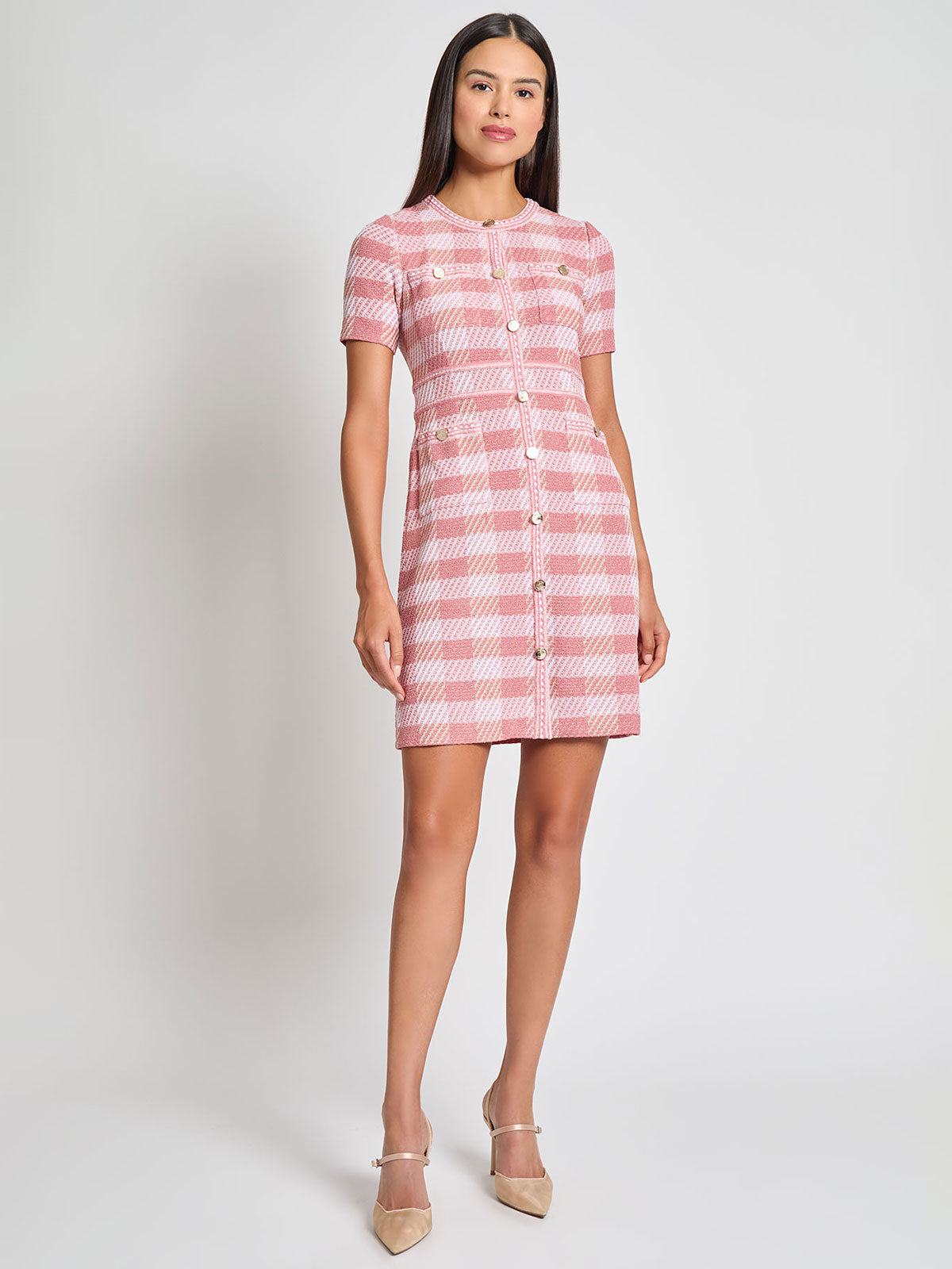 Elegance at its finest, this polished Tweed Knit Sheath Dress is a sophisticated choice accentuated with classic feminine accents. Bold novelty buttons radiate against a lively plaid pattern of a vibrant array of soft hues beautifully playing off each other.