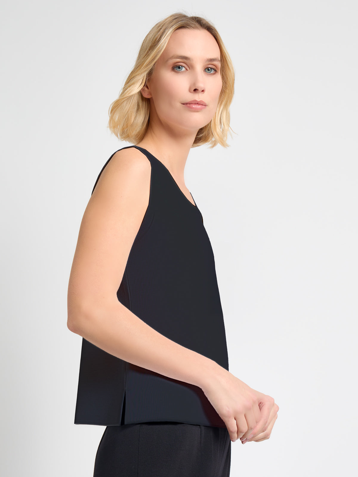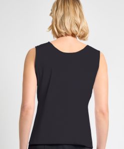 This 23″ pullover, double scoop-neck tank is a statement-worthy piece perfect for layering. Falling right at the hips, this tank is slimming for all sizes. This tank is crafted in our signature wrinkle-resistant knit, and it holds its shape throughout your busy day. Wear it on its own or layered under your favorite Misook jacket for a look that is as professional as it is polished.