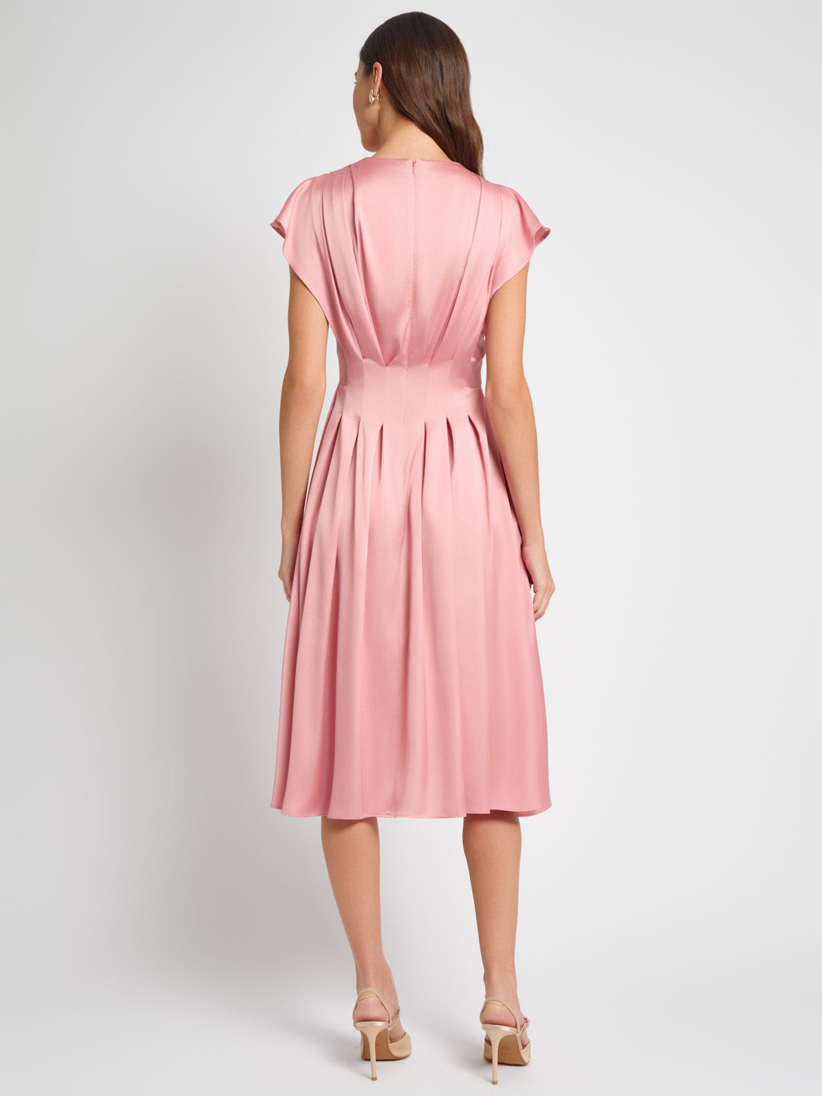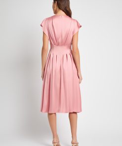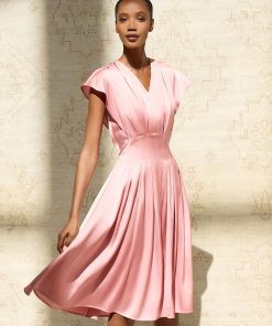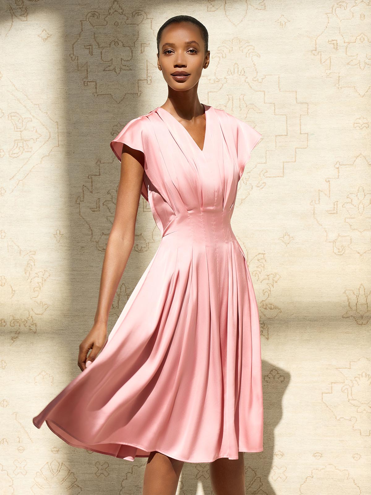 Step out in sophisticated style with the Fit & Flare Tuck Waist Midi Dress. Crafted from luxurious crepe de chine, this dress offers a smooth, polished look with a flattering fit and flare silhouette. Featuring a V-neckline, flutter cap sleeves, and a back zipper closure, this midi dress is perfect for formal occasions and evening events. The tuck waist detailing adds structure and shape, creating a stunning, feminine profile.