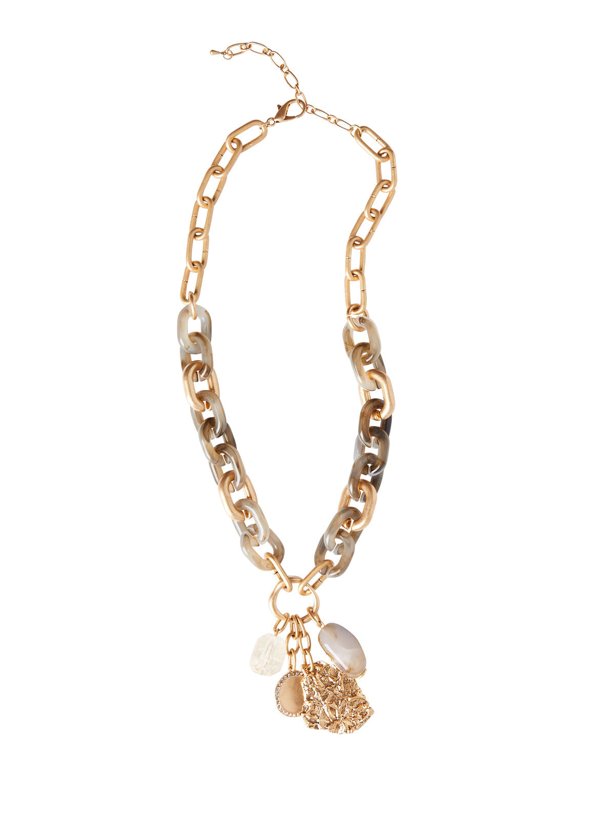 Enjoy the bold combination of natural and handmade elements with the eclectic design of our Hammered 18K Gold Olive Resin & Sage Bead Charm Necklace. Its long chain combines 18K warm gold links patterned with smooth olive resin links. Sage beads and gold charms create a luxurious cluster of rich details at the chest. Pair them with tailored pieces to play up a sharp sophisticated construction.