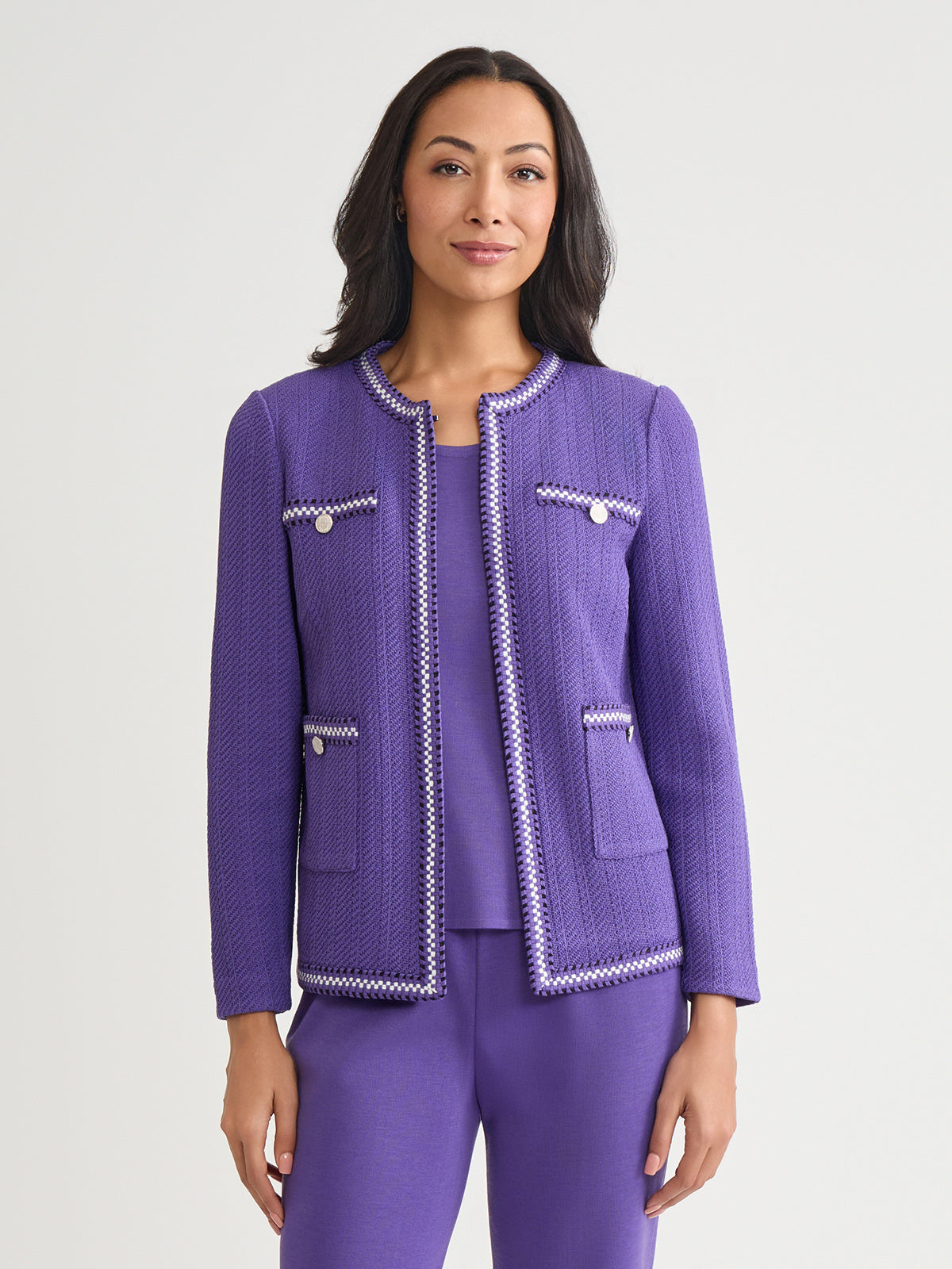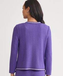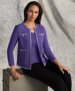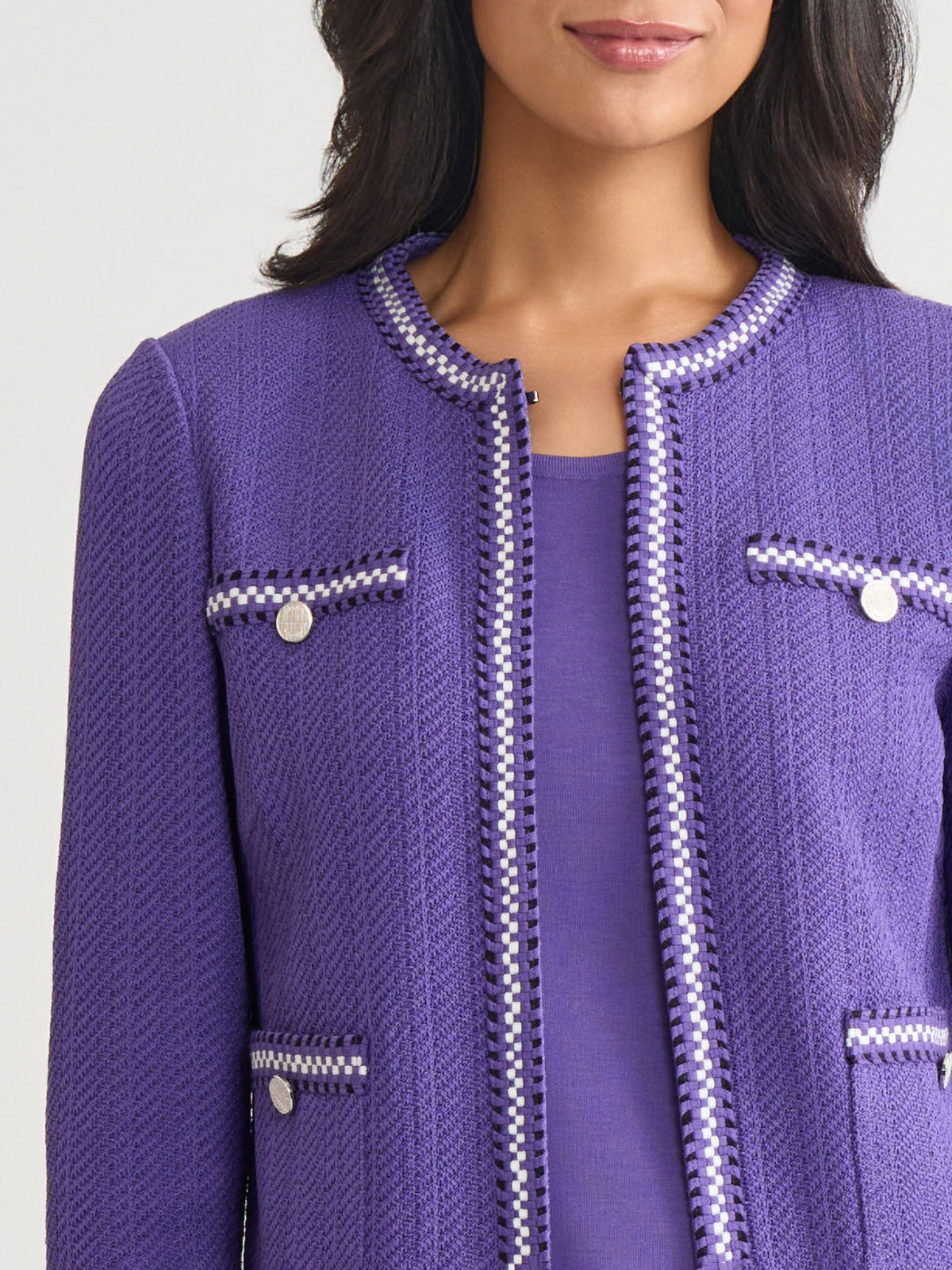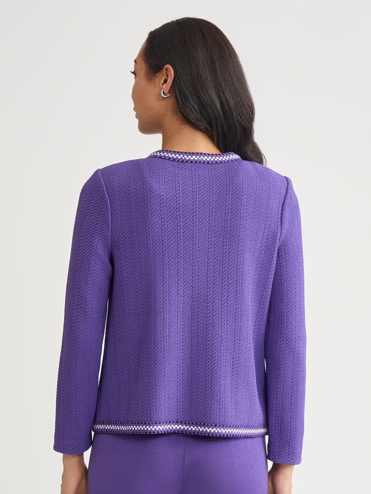 Misook Women’s Heritage Checkered Trim Knit Jacket – True Fit | Concord Purple & Black & New Ivory