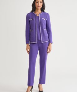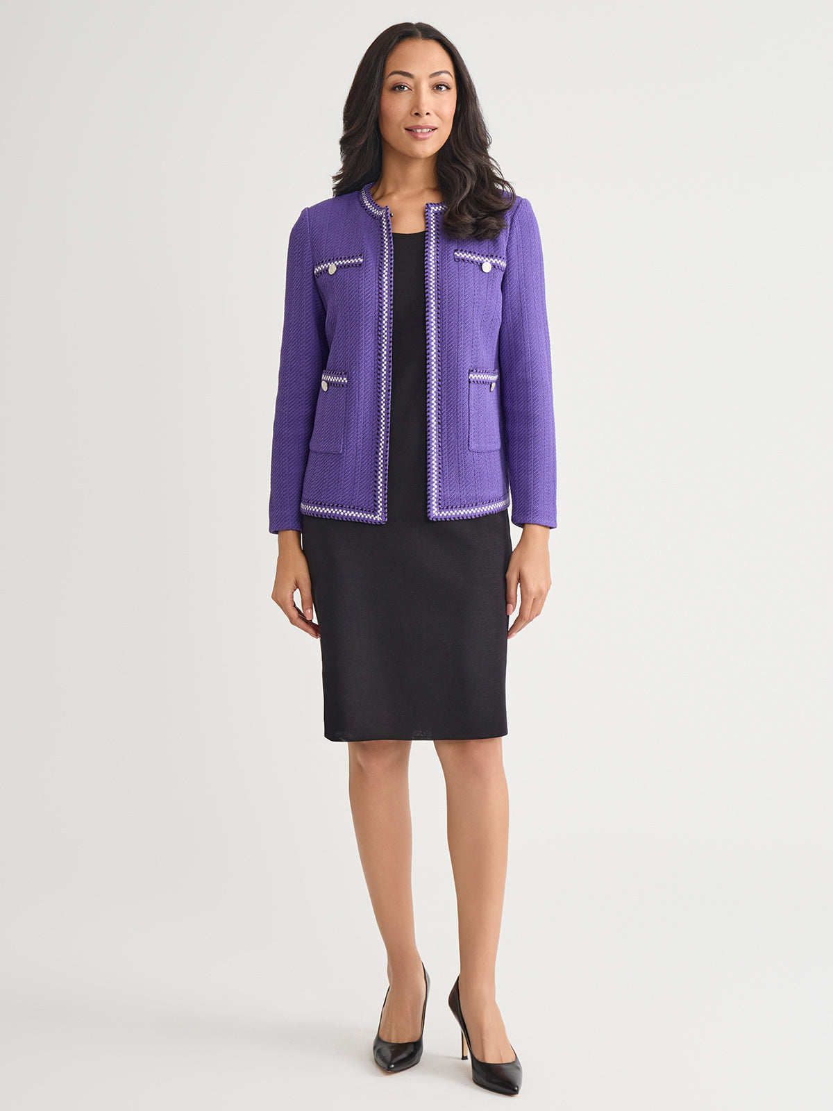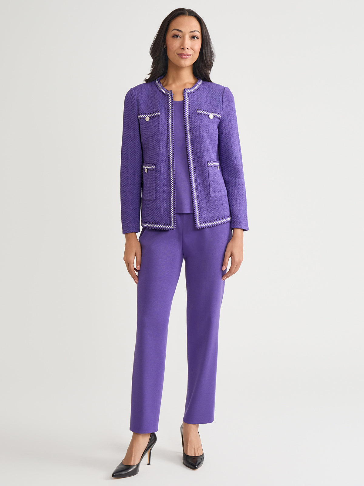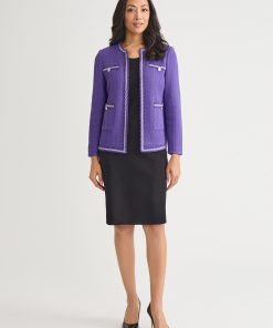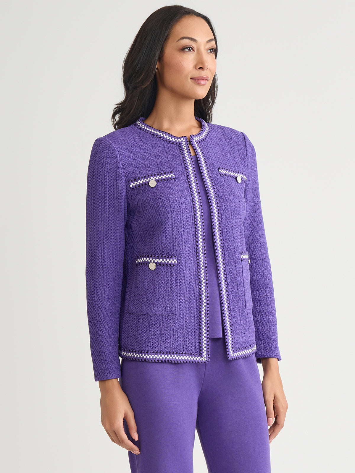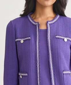 Misook Women’s Heritage Checkered Trim Knit Jacket – True Fit | Concord Purple & Black & New Ivory