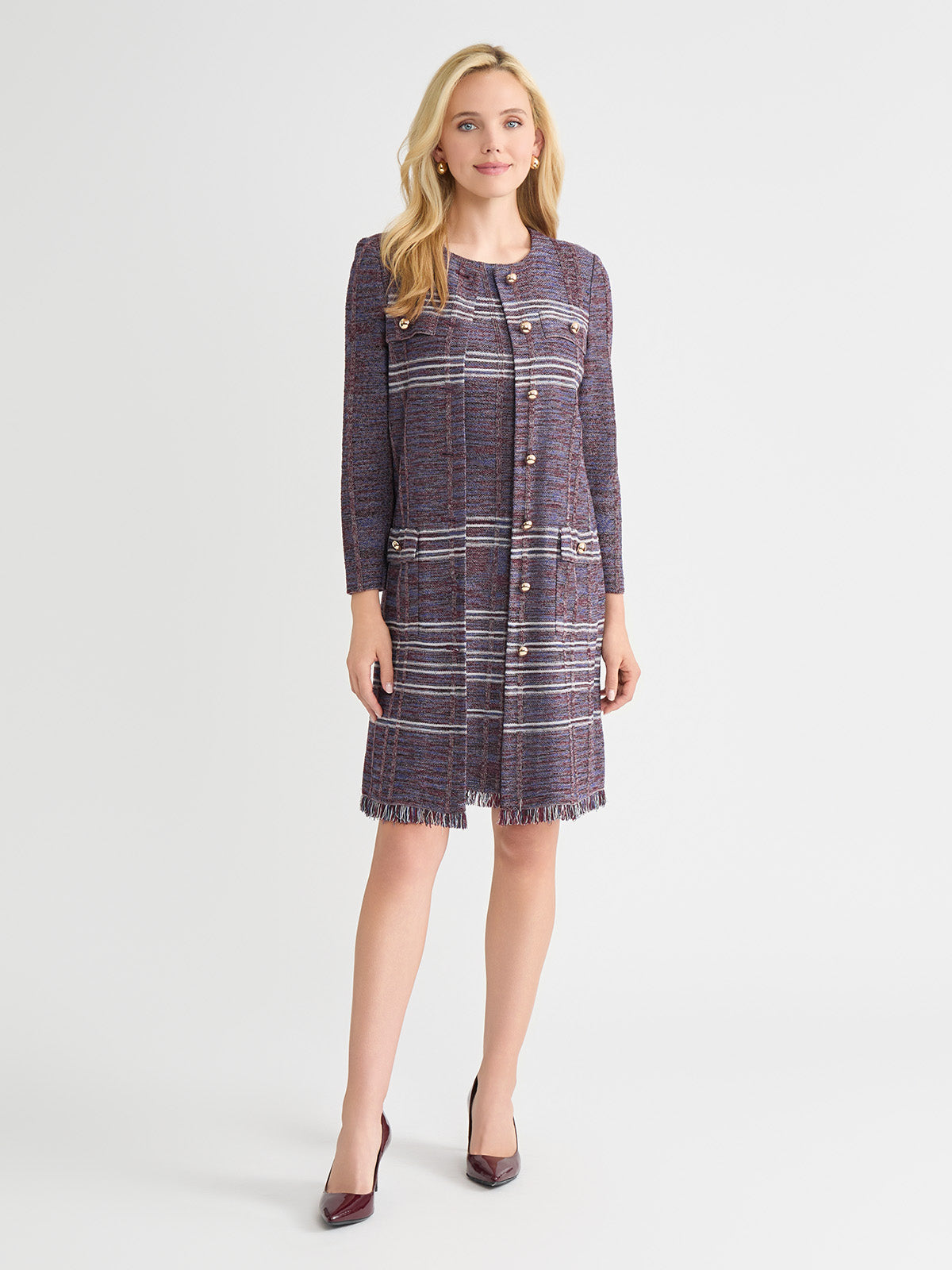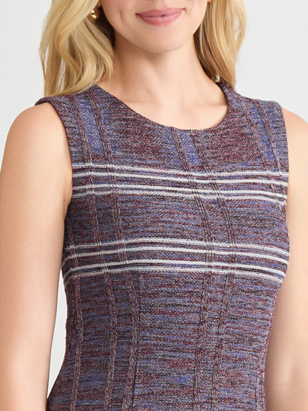 Sleek, tailored, and effortlessly elegant—the Sleeveless Mélange Fringe Trim Knit Sheath Dress is designed to make a lasting impression. Crafted from a beautifully textured knit with subtle mélange tones, this 38-inch sheath silhouette skims the figure with refined ease. Perfect for date nights, receptions, or gallery evenings, this dress is a versatile statement in modern occasion dressing. Pair under the matching Melange Jacket for a tonal look.