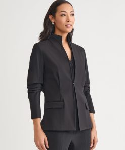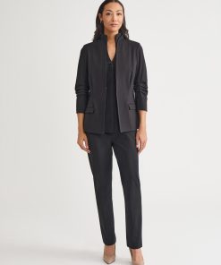 This Stretch Ponte Blazer is the epitome of refined professionalism, expertly designed to complement your work wardrobe with style and sophistication. The pleated detailing at the elbow adds a unique touch, while the modified mandarin neckline provides a modern and sleek look. Functional pockets offer both style and practicality, ensuring convenience throughout your busy day. With a tailored fit that contours to your shape, this blazer delivers a flattering silhouette and unmatched comfort, making it an essential piece for any professional setting.